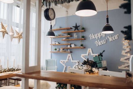 View over modern kitchen decorated for Christmas with decorative stars, objects and decorative Christmas tree with Christmas presents.