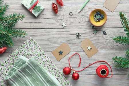 Christmas flat lay in grey, green, white and red, text space on wooden boards. Xmas background with gift boxes and handmade decorations