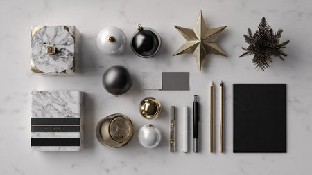 Merry Christmas season concept stationery mockup top view set template: empty paper notebook with pencil, vintage gift boxes, labels and stationery elements.