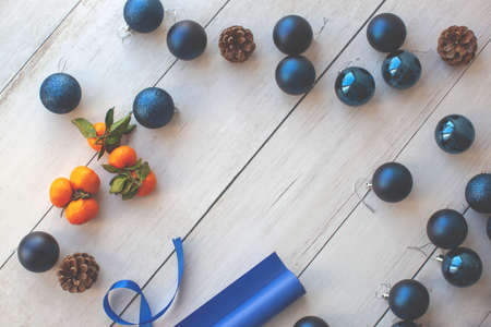 Christmas balls, layout for the New Year and Christmas. Tangerines, pine cones and brown paper. Flat lay, top view, copy space.