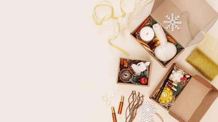 Holiday banner with gift boxes with candles, aroma sticks, natural oils, decorations. Making Christmas sets for meditation, relaxation and self-care. Preparing surprise for Christmas and New Year