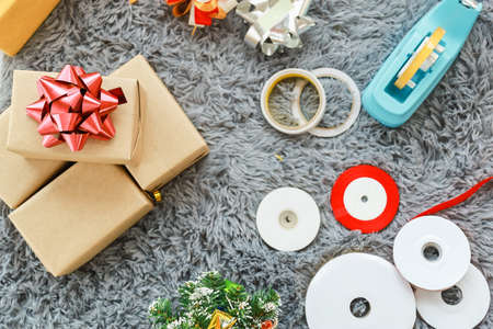 Christmas festive Concept. Flat lay of gift box, decorations, ribbons, paper, tape, wrapped gift on wool carpet background.