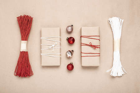 Gifts, paper ribbons, decorative balls on a craft background. Top view, flat lay
