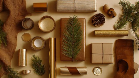Retro christmas, wrapping station desk view from above, DIY xmas concept