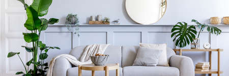 Stylish living room interior with design gray sofa, coffe table, rattan pouf, basket, shelf, mirror, tropical plants, decoration, carpet and elegant personal accessories in modern home decor.