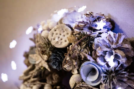 Round Christmas wreath made of cones, spruce branches, stars, berries and other decorative elements, pollinated with silvery white paint and decorated with a glowing garland. New Year interior decor.
