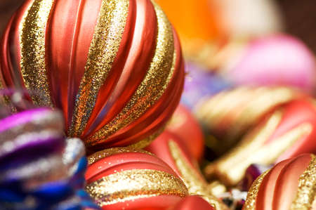 Decorated Christmas tree with balls, beads and baubles. Close-up.