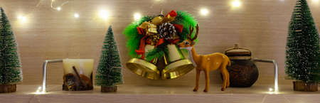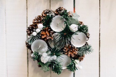 Christmas, New Year holiday layout background, texture, wallpaper. Flat-lay of decorative objects, fur tree toys, garland, rope, candles, glass balls, wreaths over rustic wooden background, copy space