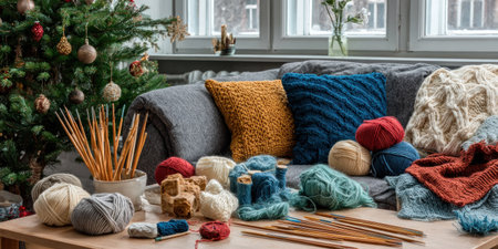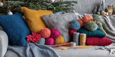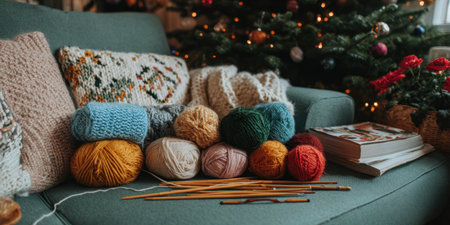 Cozy scene yarn, knitting needles, pillows, and a Christmas tree create a warm, inviting setting