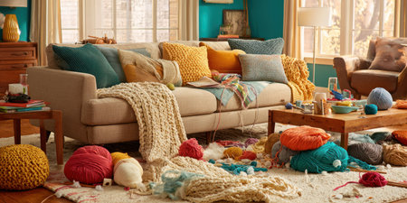 A living room interior is presented showcasing a sofa adorned with colorful cushions and knit blankets. Scattered yarn balls, a coffee table, and other decorative elements complement the scene. The warm lighting and soft textures create a relaxing atmosphere. Suitable for a range of commercial applications.