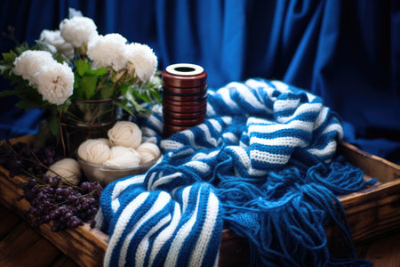 knitting a blue and white wool scarf for hanukkah, created with generative ai