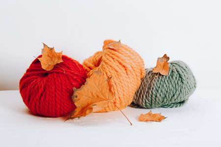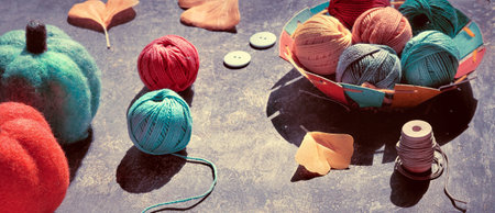 Panoramic banner with craft materials for knitting and crochet on dark table. Yarn balls, decorative felt pumpkins, Fall leaves with shadows.