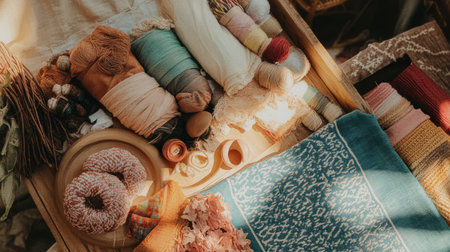A bohemian setup featuring yarn, fabric, and traditional crafts, arranged on a textured surface with rich colors.