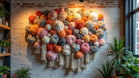 Colorful yarn wall art installation with bright pom poms in cozy room. That the image is generated using AI.