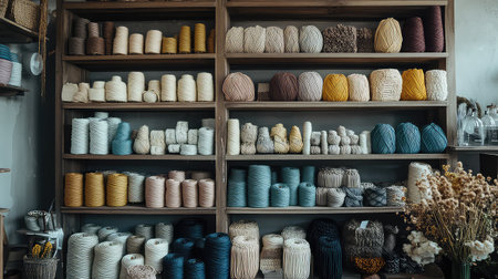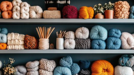 Vibrant yarn collection displayed on shelves, showcasing various textures and colors. Ideal for crafting, knitting, and creative design inspiration.