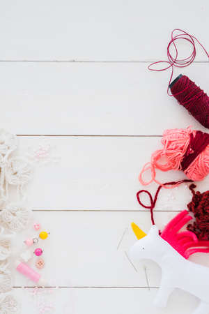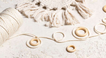 Macrame accessories on white concrete background. Creative hobby concept. Top view