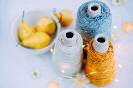 Three natural gray, yellow and white tweed yarn in bobbins for knitting and handmade in winter