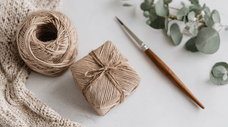 Flat lay featuring a tied gift box, a ball of light brown yarn, and a paintbrush, all resting on a light-colored surface. The colors are neutral and the overall composition is simple, clean and elegant, evocative of a creative or home d