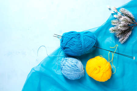 The yarn is blue, blue and wishing lies on a blue background, next to pine snow-covered branches. Winter hobby, DIY gifts, horizontal orientation, flat lay, copy space.