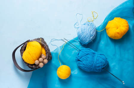 Skeins of blue, blue, yellow yarn lie on a light blue background, next to it there is a wicker basket with yarn. Hobby knitting, horizontal orientation, flat lay, copy space.