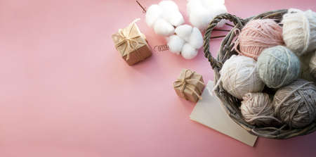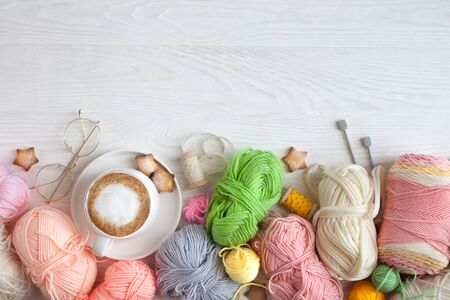 Cozy homemade composition with pastel color threads for knitting, yarn on a blurred background.