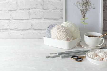 Yarn of light neutral shades in a white basket. Wall of old brick. Gray vase in the Scandinavian style.