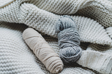 Knitting materials and soft yarn on a cozy blanket in a warm indoor setting