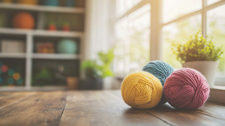 Three vibrant yarn balls in yellow, blue, and pink are artistically arranged on a wooden surface with a bright green plant, offering a warm, cozy atmosphere.