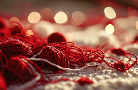 A close-up of red yarn balls on a white fabric background with bokeh lights.