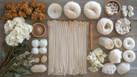 This warm, inviting scene showcases a variety of soft yarns and textiles arranged thoughtfully on a wooden table, perfect for inspiring creativity and DIY projects.