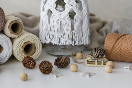 Composition with bobbins of threads in pastel colors, sled with a cone on top, a jar decorated with macrame from white threads on a white table
