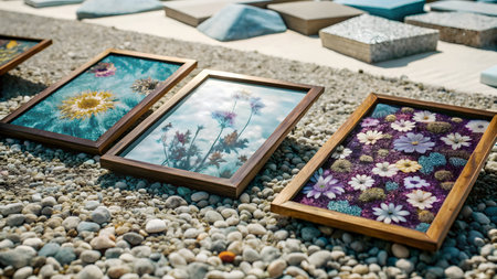 Picture frames with flowers on the pebble beach in the sun