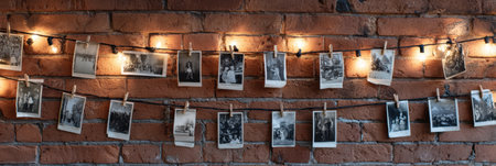 A collection of vintage black and white photographs is displayed on string lights, pinned to a rustic brick wall. The setup evokes a warm, nostalgic atmosphere.