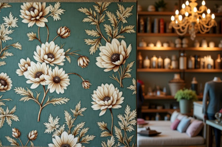 Cozy boutique interior with floral wallpaper and elegant chandelier. That the image is generated using AI.