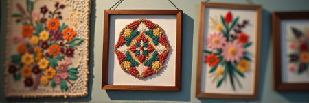 Colorful embroidered floral art on wall - decorative textile patterns in wooden frames. That the image is generated using AI.