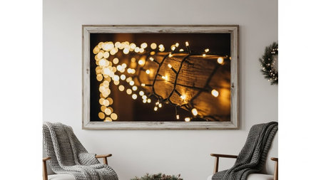 Interior of modern living room with christmas lights garland on wall