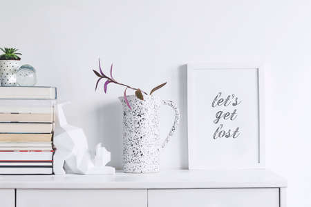 Creative cupboard with mock up poster frame, cat figures, pink flower in stylish vase and books. Modern and minimalistic concept of shelf.