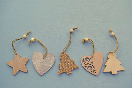 Christmas toys on a blue background.Happy winter holidays.Christmas card.