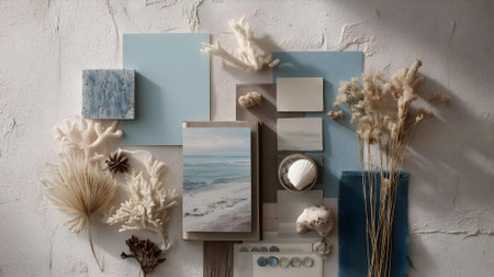 A circular wooden table adorned with aqua seashells and a picture of a beach scene. The combination of natural elements and coastal imagery creates a soothing and inviting atmosphere in the room AIG50