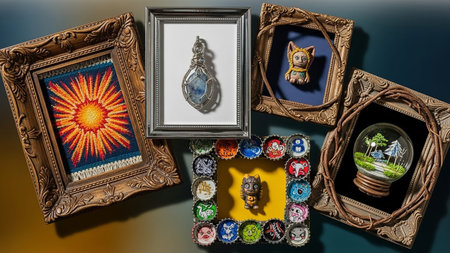 A flat lay of various framed handmade crafts, including embroidery, jewelry, miniatures, and a snow globe, arranged artfully.