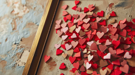 Hearts confetti in a wooden box on a textured background