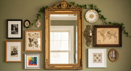 a gallery wall with a mix of framed photos and art pieces, created with generative ai