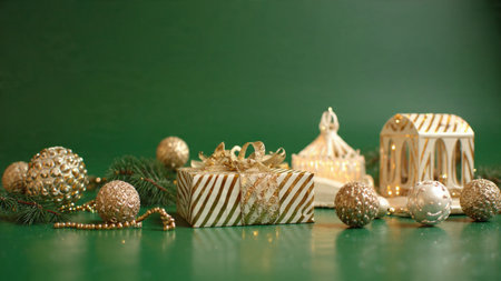 Christmas decoration with gift box and baubles on a green background