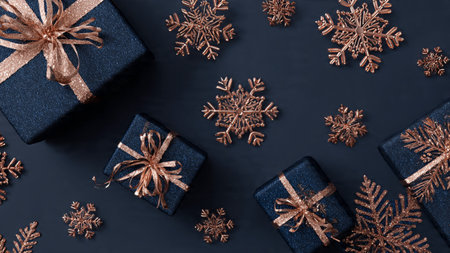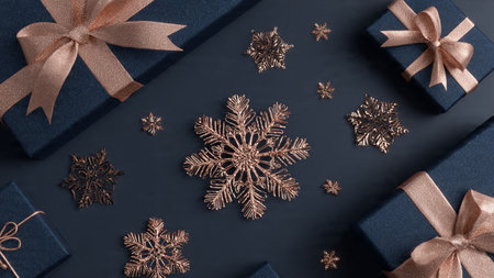 A shimmering rose-gold holiday layout arranged atop a smooth deep-blue background for elegant contrast.