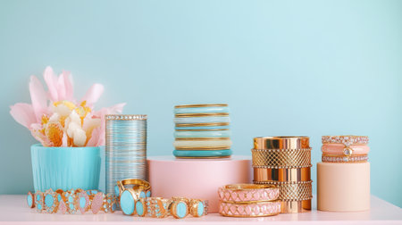 A vibrant display of stylish bracelets and accessories sits on a pastel background, featuring turquoise, gold, and pink tones, perfect for fashion enthusiasts.