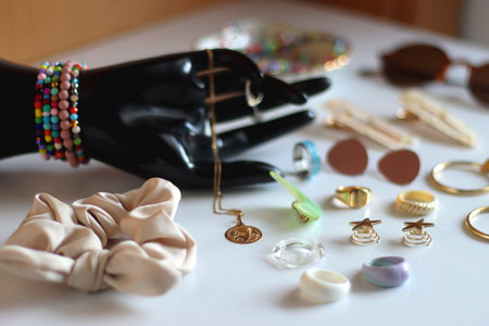 Hand figurine, sunglasses, gold jewelry, colorful bead jewelry, statement rings and various hair accessories on the white table. Selective focus.