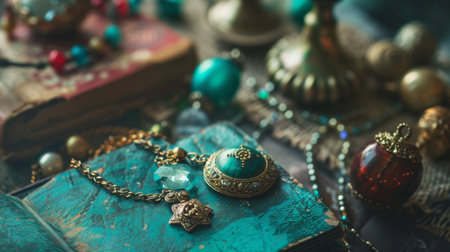 This captivating image features a beautifully arranged vintage jewelry piece, showcasing intricate designs and colorful stones, evoking a sense of warmth and elegance.