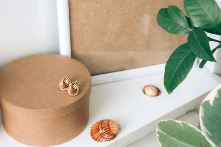 Still life. Blank beige poster frame, craft round box and indoor evergreen potted plant, beautiful gold earrings on the white wall. Home office