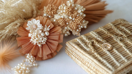 A beautiful display featuring floral accessories, pearls, and a textured basket clutch, showcasing soft colors and artistry for fashion and decor enthusiasts.
