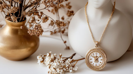 A stunning close-up of a vintage gold pocket watch necklace with a beautiful floral arrangement, perfect for showcasing elegance and timeless beauty in photography.